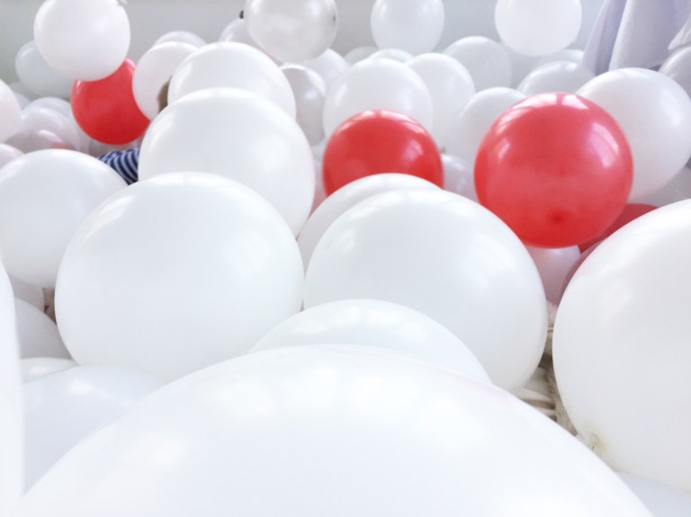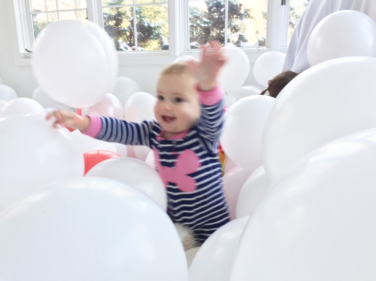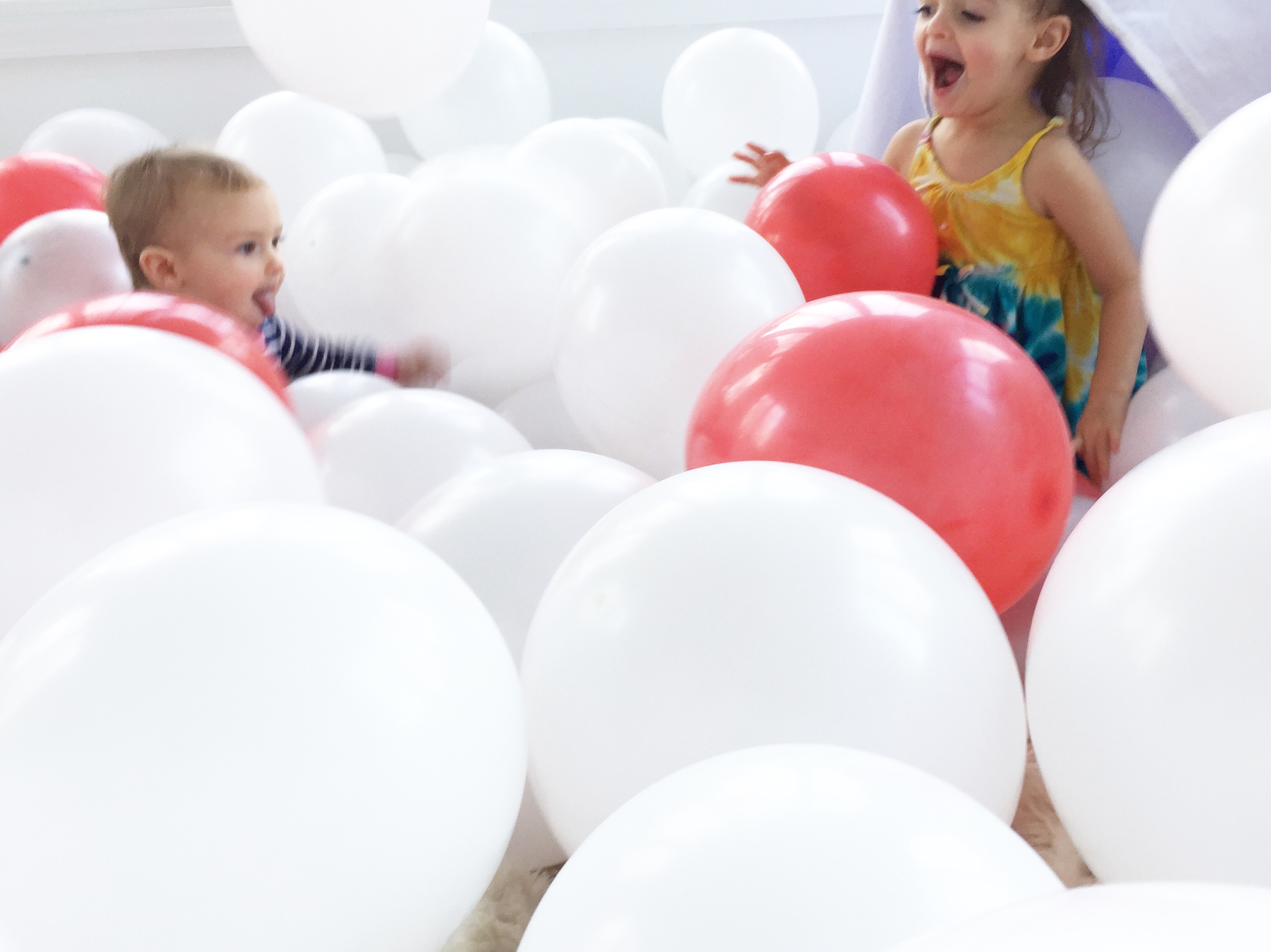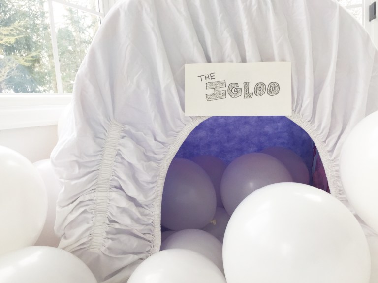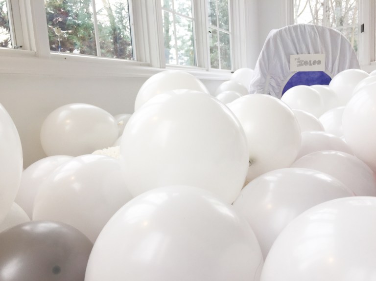 Somehow, I successfully blew up 100 balloons… by myself… without passing out… but it was all worth it to complete this North Pole wonderland for my girls! If all those balloons popped, it would smell like a wonderland of chocolate mocha breath. This vision came from me being a huge kid at heart and living vicariously through my children. Endless entertainment for only $20 and a little imagination 🙂